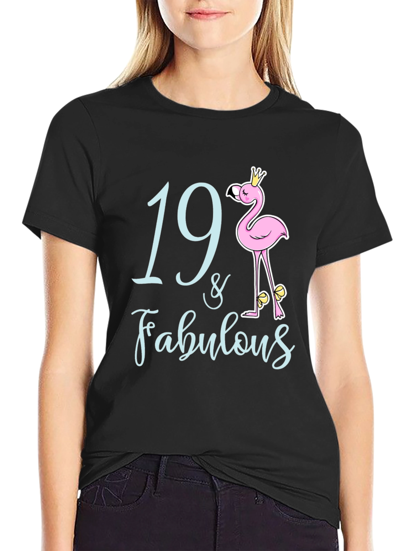 Celebrate a 19th birthday in style with this fun and fabulous t-shirt. This black tee features a light blue "19 & Fabulous" design, complemented by an adorable pink flamingo graphic wearing a crown. The playful design makes it perfect for a birthday party or casual wear, adding a touch of whimsy to any outfit. Made from a comfortable and breathable fabric, this t-shirt is ideal for all-day wear. It’s a standout piece for birthday celebrations and a unique gift idea for someone turning nineteen. Get ready to turn heads and make a statement!