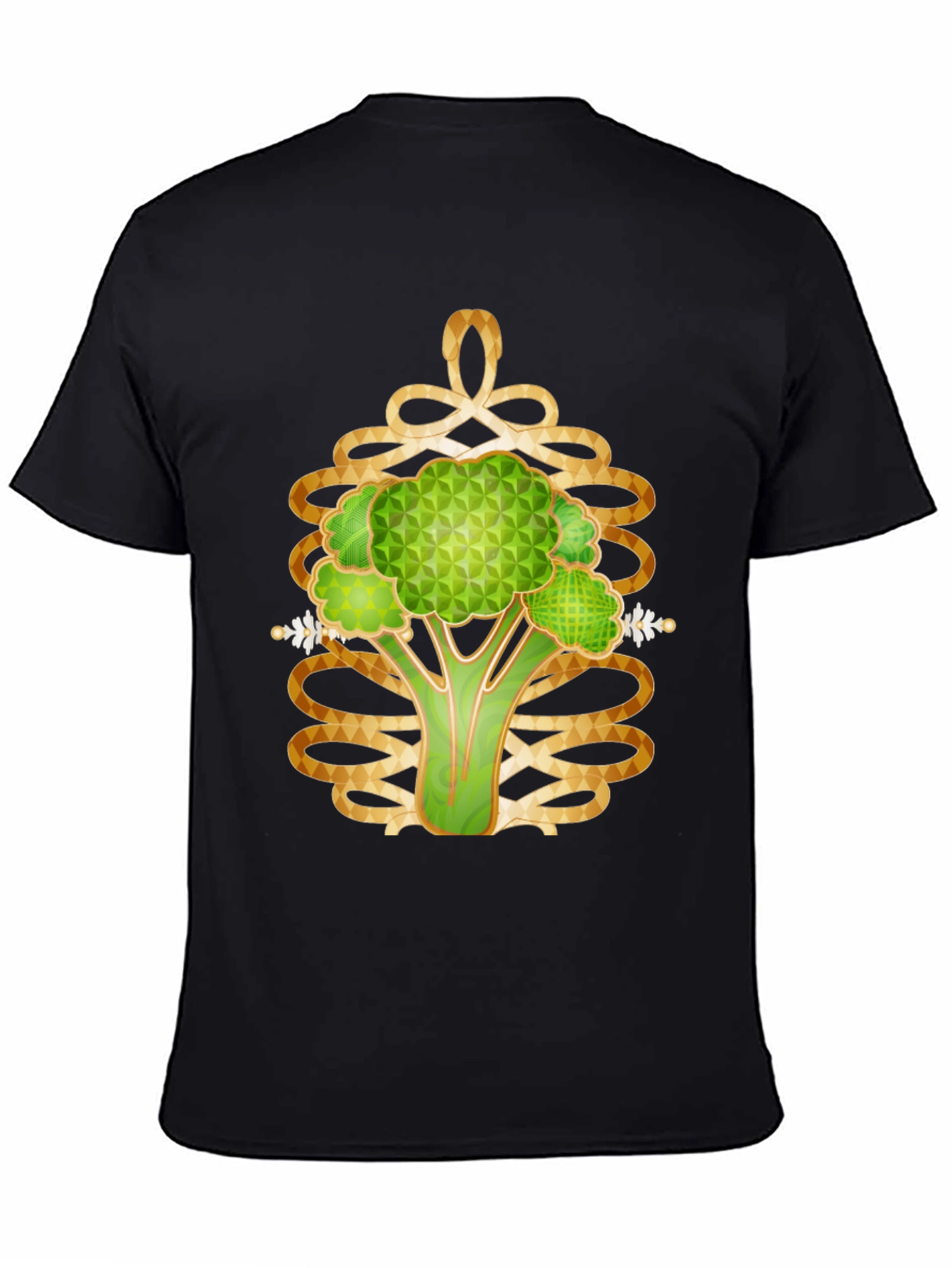 Elevate your style with this unique graphic tee! Featuring an eye-catching, stylized broccoli design, this black t-shirt is sure to turn heads. The broccoli is intricately detailed with a geometric pattern and accented with gold flourishes, giving it a modern, artistic vibe. Perfect for casual wear, this tee can be paired with jeans or shorts for a relaxed yet fashionable look. Made from a soft, breathable fabric, it ensures all-day comfort. Stand out from the crowd and express your individuality with this bold and creative t-shirt. It's a must-have addition to any wardrobe!