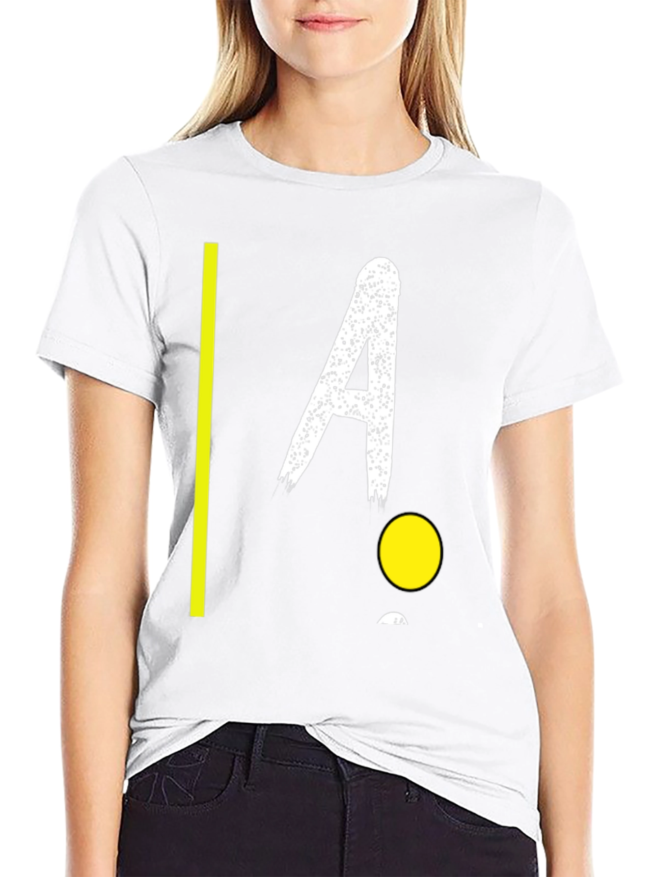Showcase your unique style with this eye-catching graphic t-shirt. This black tee features a modern abstract design, including a striking white letter 'A', a bold yellow stripe, and a solid yellow circle. The design has a distinctive textured look, adding a contemporary artistic element to your everyday wardrobe. Made from comfortable fabric, this tee is perfect for casual outings, artistic events, or making a bold fashion statement. Pair it with jeans or shorts for a relaxed yet stylish look. This abstract graphic tee is sure to turn heads and spark conversation.