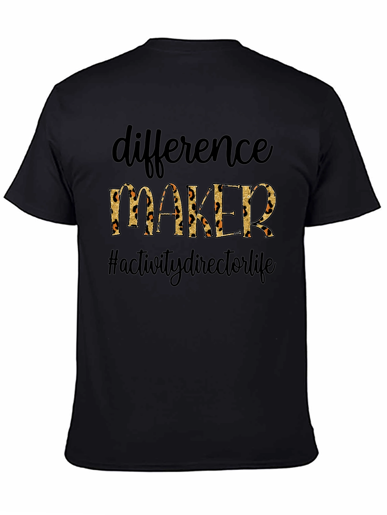 Show your passion with this stylish black tee! The design features the words 'difference MAKER' in a fun, leopard print design. Accented by the hashtag '#activitydirectorlife', this shirt is perfect for activity directors. Made from a soft, comfortable fabric, this t-shirt is ideal for everyday wear. The crew neck and classic fit make it a versatile addition to any wardrobe. Wear it to work, casual outings, or even just relaxing at home. A great way to express your dedication and pride in your profession! Makes a thoughtful and unique gift for the activity director in your life.