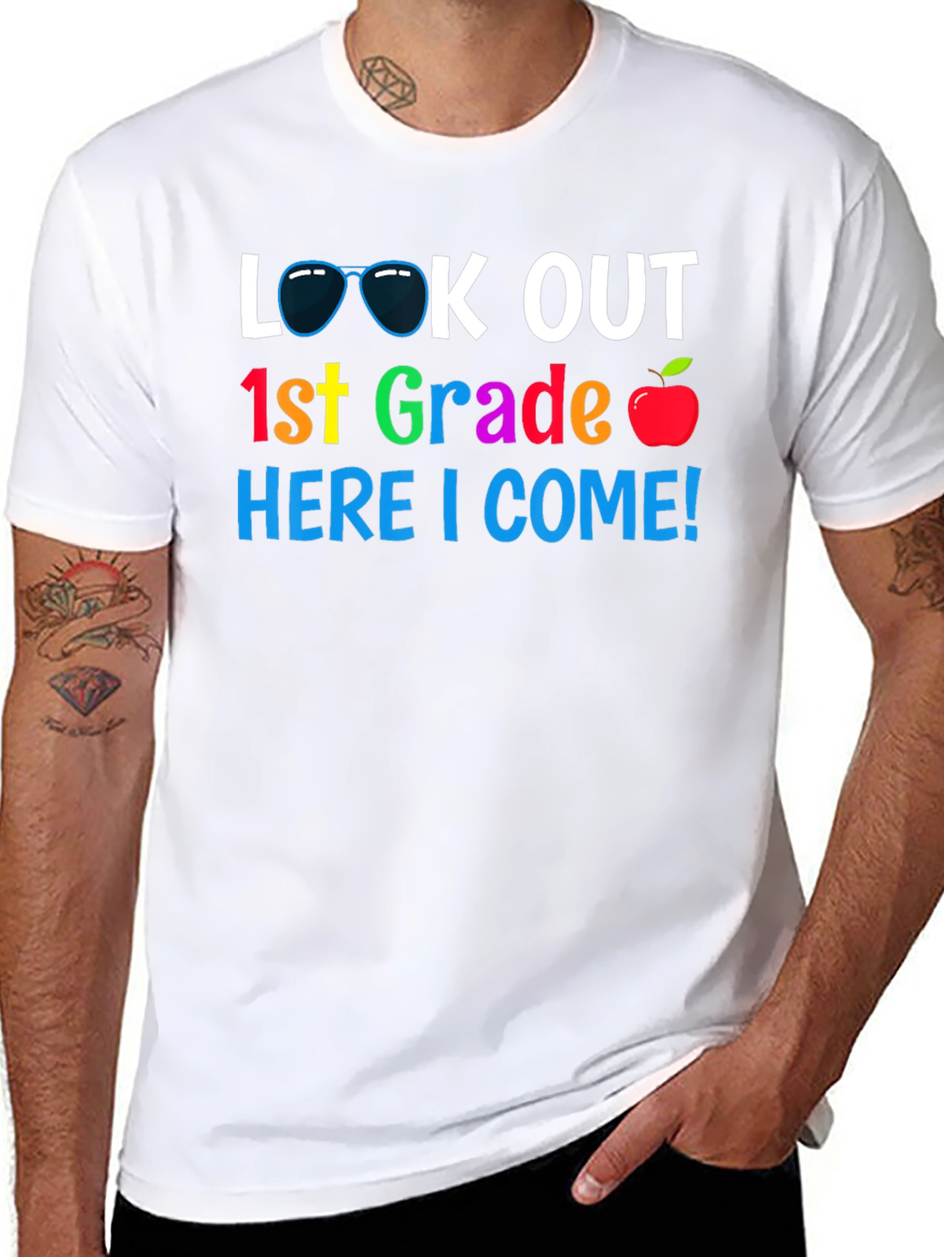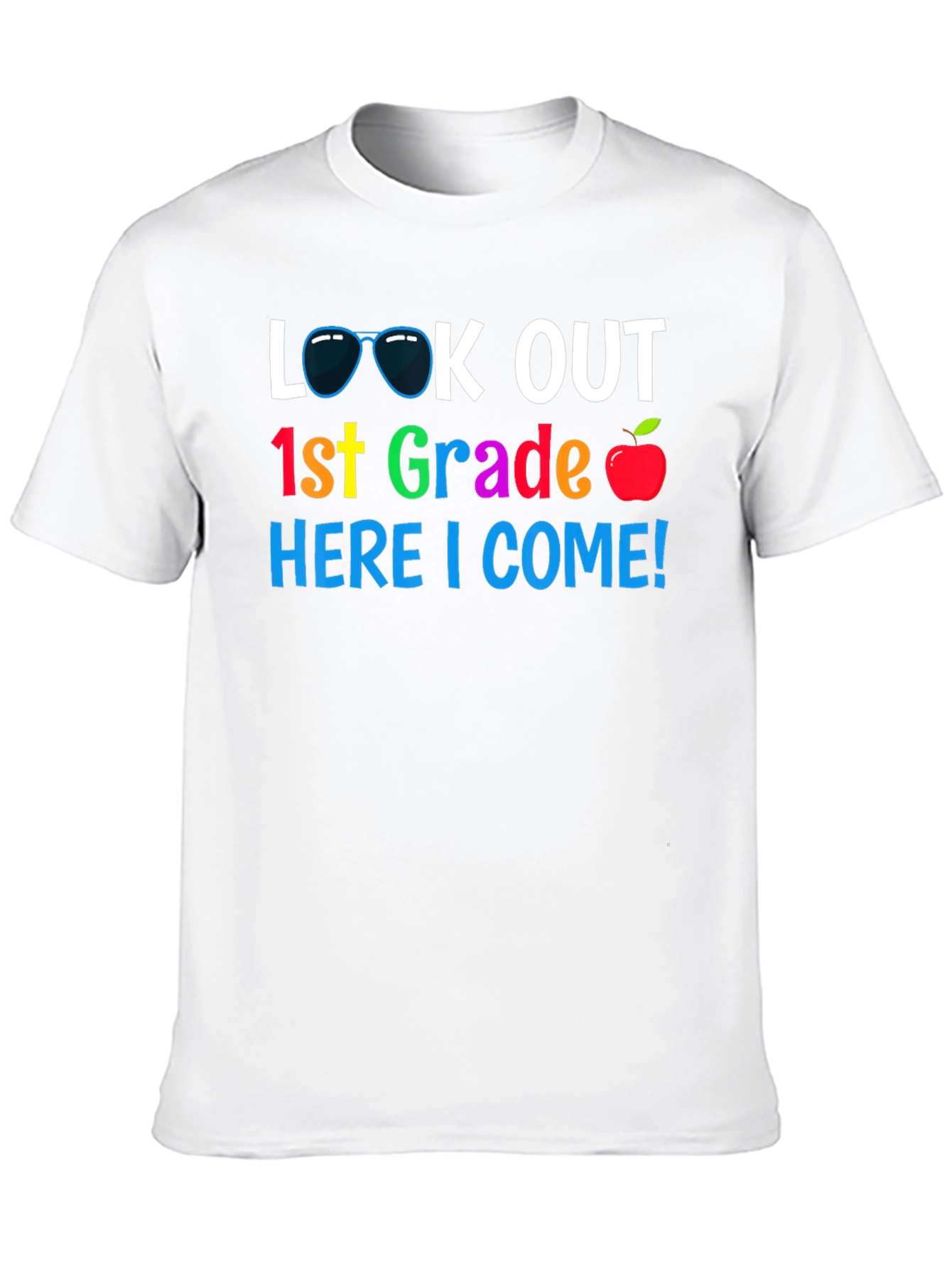 Gear up for the first day with this fun and vibrant "Look Out 1st Grade Here I Come!" t-shirt. The design features a pair of stylish sunglasses, the words "1st Grade" in bright, eye-catching colors, and a playful red apple graphic. The tee is made from a soft, comfortable black fabric, perfect for all-day wear. Let your little one make a statement and show off their excitement for school with this unique shirt. Whether it's for the classroom or casual outings, this t-shirt is sure to be a hit and a great way to start the school year!