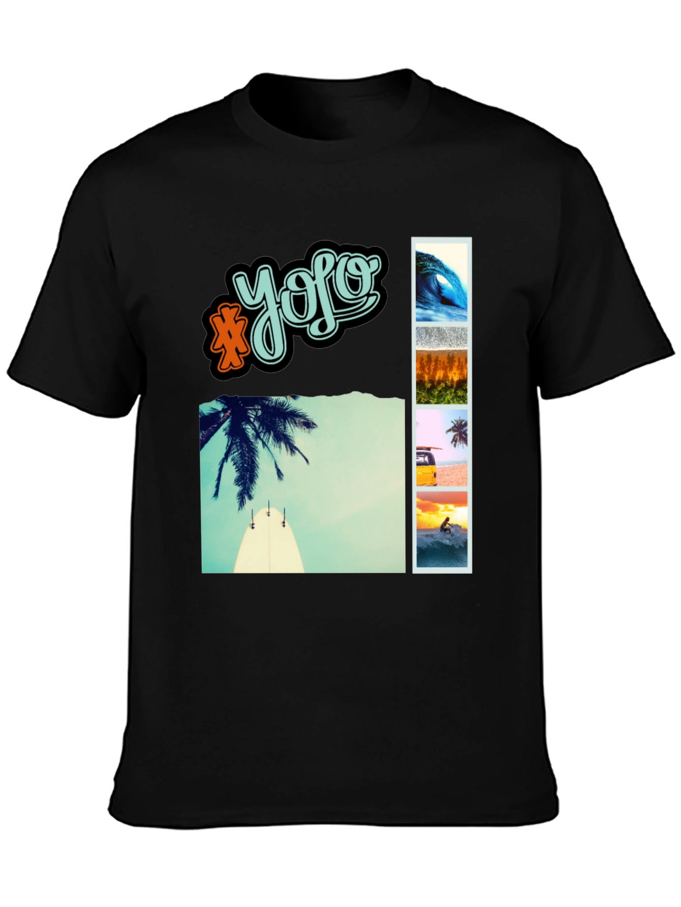 Embrace the carefree spirit of summer with this stylish men's black t-shirt. Featuring a vibrant and eye-catching graphic print that captures the essence of beach life. The design includes a '#yolo' slogan with surf and palm tree elements. The shirt is a classic fit, suitable for everyday casual wear. Ideal for beach outings, vacations, or simply expressing your love for the ocean. Made from soft, breathable fabric, this tee offers comfort and style in equal measure. Get yours today and rock the beach vibes!