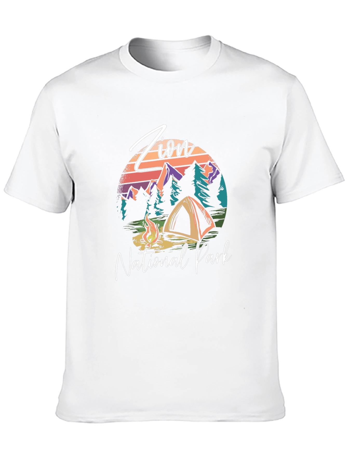 Embrace the call of the wild with this eye-catching black graphic tee! The design features a vibrant illustration of Zion National Park, complete with majestic mountains, towering pine trees, a cozy tent, and a crackling campfire. The words "Zion National Park" are written in a stylish script. Perfect for outdoor enthusiasts and nature lovers, this shirt is ideal for camping trips, hiking adventures, or casual everyday wear. Show off your love for the great outdoors with this unique and comfortable tee!